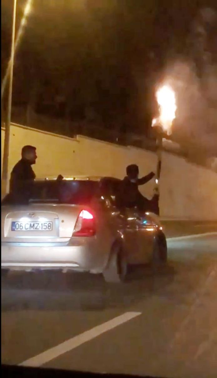Akılalmaz olayda, aracın sağ ön camından dışarıya sarkan kişi, elindeki pompalı tüfekle havaya 3 el ateş etti. Bu sırada aynı araçta bulunan başka bir kişi de sol arka camına oturarak yolculuk yaptı.