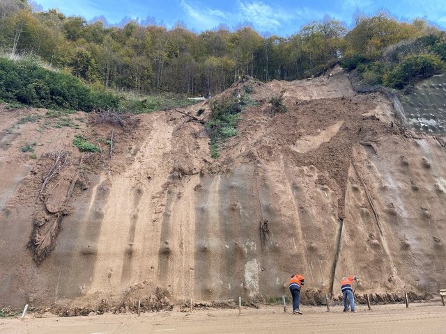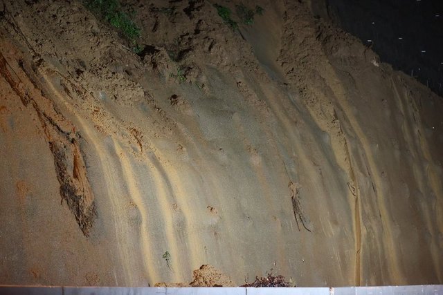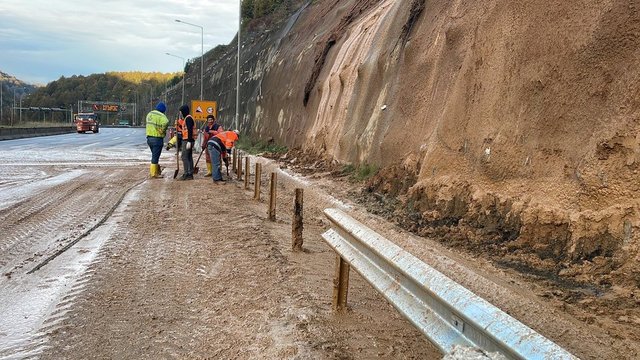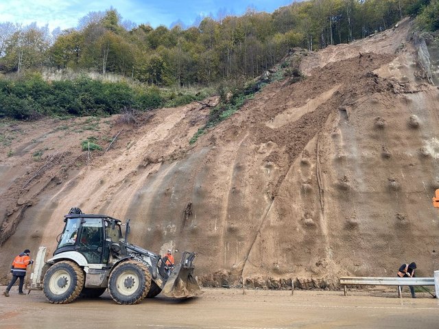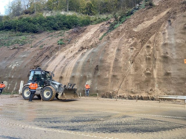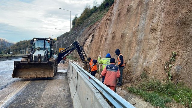 Tünel çıkışından yaklaşık 1 kilometre sonra yol kenarındaki alanda dün akşam meydana gelen ufak çaptaki akmaların ardından kapatılan yolda günün ilk ışıklarıyla ekiplerin çalışmaları başladı.