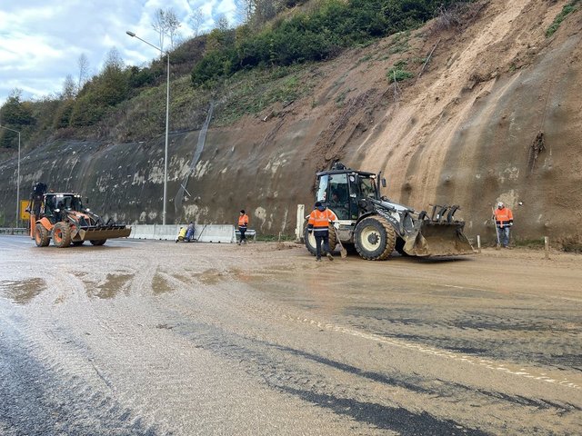 Gece boyunca aralıklarla devam eden yağış nedeniyle yola akan çamurları temizleyen Karayolları ekipleri, iş makineleriyle de kanallara dolan çamur ve toprak yığınlarını kaldırıyor.