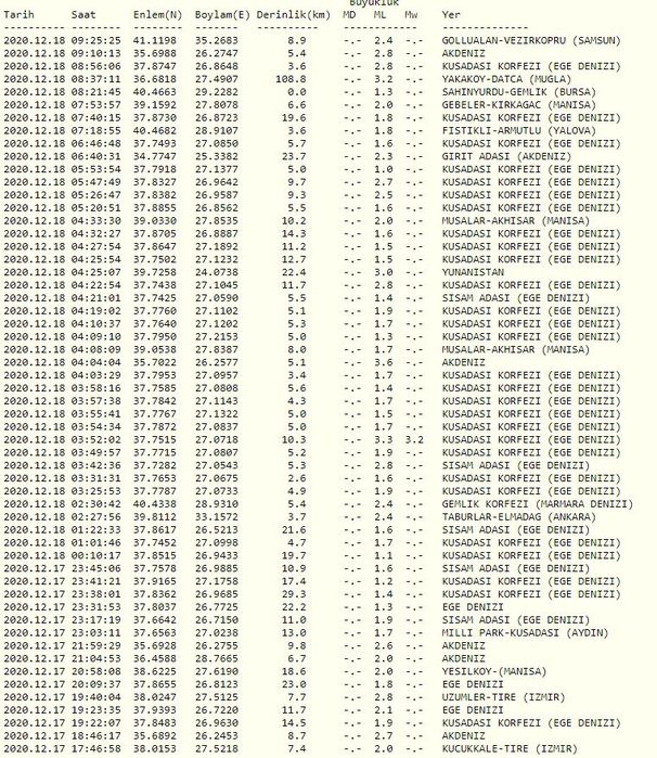 AFAD SON DEPREMLER 18 ARALIK TABLOSU: