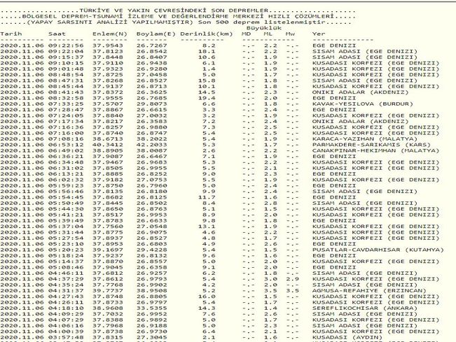 Kandilli Rasathanesi son depremler tablosu geçtiğimiz gün Marmara Denizi'nde meydana gelen ve akıllara İstanbul depremi riskini getiren deprem sonrası gözler Kandilli Rasathanesi'ne çevrildi. Öte yandan İzmir depremi sonrası artçı sarsıntılar devam ederken Ege Bölgesi'nde yaşayanlar hissettikleri sarsıntılar sonrasında "Deprem mi oldu?" sorusunun cevabını merak edip araştırıyor. Peki, son deprem ne zaman oldu? İşte, 6 Kasım Kandilli son depremler tablosu....