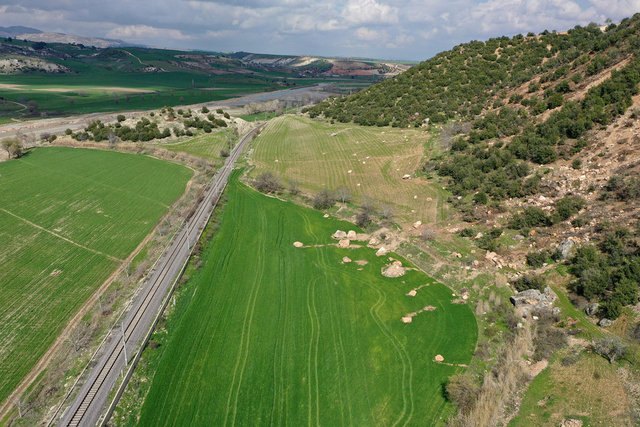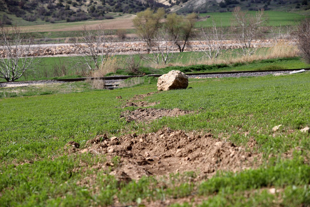 Yuvarlanan kayalardan bir bölümünün tarlanın yanındaki tren raylarına kadar ulaştığı görüldü. Tarlalardaki kayalar dron ile görüntülendi.