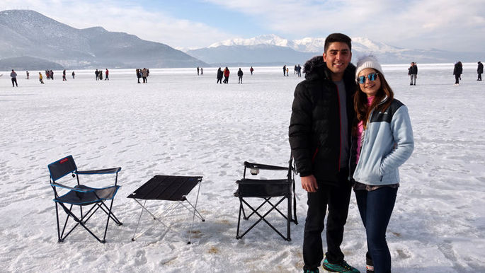 Isparta'da buz tutan Eğirdir Gölü üzerinde yürüyen, köpeğini gezdirenler ve masa sandalye atarak çay kahve içenler, buz tabakasının yüzde 90 erimiş olmasına ve uyarılara aldırmadı