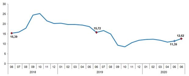 TÜİK, haziran ayı enflasyon rakamlarını açıkladı. Buna göre tüketici enflasyonu haziran ayında yüzde 1.13 yıllık yüzde 12.62 oldu. Beklenti aylık 0.70 artış ile yıllık yüzde 12.14 seviyesindeydi. Çekirdek enflasyon yıllık 10.32'den 11.64'e çıktı. Ana harcama grupları itibarıyla 2020 yılı Haziran ayında azalış gösteren tek ana grup yüzde 1,60 ile gıda ve alkolsüz içecekler oldu ancak bir önceki yılın aynı ayına göre artışın yüksek olduğu ana gruplar ise sırasıyla, yüzde 22,41 ile alkollü içecekler ve tütün, yüzde 19,80 ile çeşitli mal ve hizmetler ve yüzde 14,95 ile konut olarak gerçekleşti