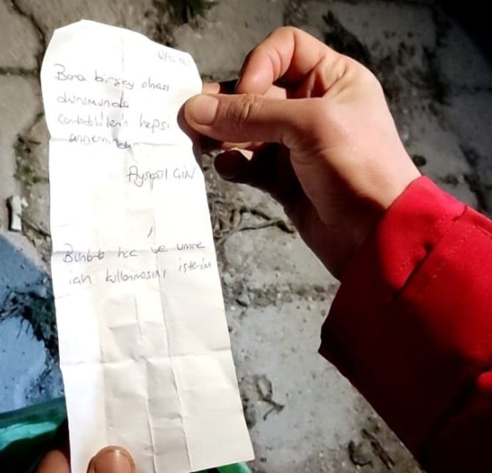 Çantanın içinde Ayşegül Çin'e ait, "Bana bir şey olması durumunda çantadakilerin hepsi annemindir. Bunları hac ve umre için kullanmasını isterim" yazılı vasiyet olduğunu fark eden ekipler, Çin'in yakınlarıyla temasa geçti.