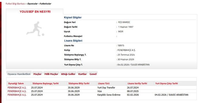 Fenerbahçe'de Youssef En-Nesyri ile yollar resmen ayrıldı. Sarı-lacivertli kulüp, Faslı santrforun sözleşmesinin karşılıklı anlaşmaya varılarak feshedildiğini ve oyuncunun Suudi Arabistan'a transfer olduğunu TFF'ye bildirdi.