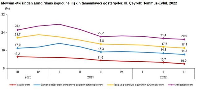 Zamana bağlı eksik istihdam, potansiyel işgücü ve işsizlerden oluşan atıl işgücü oranı 2022 yılı III. çeyreğinde bir önceki çeyreğe göre 0,5 puanlık azalış ile yüzde 20,9 oldu. Zamana bağlı eksik istihdam ve işsizlerin bütünleşik oranı yüzde 14,2 iken potansiyel işgücü ve işsizlerin bütünleşik oranı yüzde 17,1 olarak tahmin edildi.