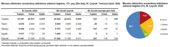 Mevsim etkisinden arındırılmış istihdam edilenlerin sayısı 2022 yılı III. çeyreğinde bir önceki çeyreğe göre tarım sektöründe 26 bin kişi, sanayi sektöründe 107 bin kişi azalırken, inşaat sektöründe 8 bin kişi, hizmet sektöründe 247 bin kişi arttı. İstihdam edilenlerin yüzde 15,8'i tarım, yüzde 21,6'sı sanayi, yüzde 5,9'u inşaat, yüzde 56,7'si ise hizmet sektöründe yer aldı.