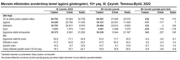Hanehalkı İşgücü Araştırması sonuçlarına göre; 15 ve daha yukarı yaştaki kişilerde işsiz sayısı 2022 yılı III. çeyreğinde bir önceki çeyreğe göre 234 bin kişi azalarak 3 milyon 433 bin kişi oldu. İşsizlik oranı ise 0,7 puanlık azalış ile yüzde 10,0 seviyesinde gerçekleşti. İşsizlik oranı erkeklerde yüzde 8,7, kadınlarda yüzde 12,8 olarak tahmin edildi.