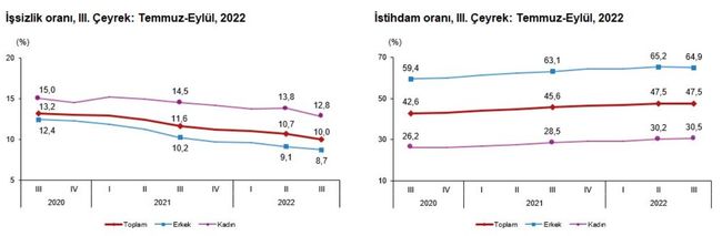 İstihdam edilenlerin sayısı 2022 yılı III. çeyreğinde bir önceki çeyreğe göre 123 bin kişi artarak 30 milyon 787 bin kişi, istihdam oranı ise değişim göstermeyerek yüzde 47,5 oldu. Bu oran erkeklerde yüzde 64,9 iken kadınlarda yüzde 30,5 olarak gerçekleşti.