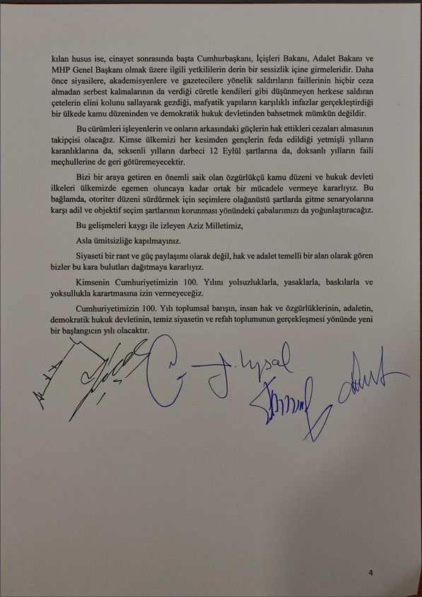 Bizi bir araya getiren en önemli saik olan özgürlükçü kamu düzeni ve hukuk devleti ilkeleri ülkemizde egemen oluncaya kadar ortak bir mücadele vermeye kararlıyız. Bu bağlamda, otoriter düzeni sürdürmek için seçimlere olağanüstü şartlarda gitme senaryolarına karşı adil ve objektif seçim şartlarının korunması yönündeki çabalarımızı da yoğunlaştıracağız.