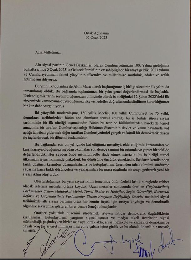 Altı siyasi partinin genel başkanları olarak Cumhuriyetimizin 100. yılına girdiğimiz bu hafta içinde 5 Ocak 2023'te Gelecek Partisi'nin ev sahipliğinde biraraya geldik. 2023 yılının ve Cumhuriyetimizin ikinci yüzyılının ülkemize ve milletimize mutluluk, adalet ve refah getirmesini diliyoruz.