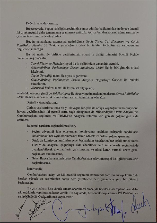 Gelecek Partisi'nin ev sahipliğinde bir araya gelen 6'lı Masa'nın 10. toplantısı sonrası ortak yazılı bir açıklama yaptı. Liderler 6 Nisan sonrasına sarkacak bir erken seçimi desteklemeyeceklerinin vurgulandı. Yazılı açıklamada Altı lider ayrıca ortak politikalar metninin 30 Ocak'ta düzenlenecek bir organizasyonda duyurulacağını açıkladı. 30 Ocak'tan önce de altı lider İYİ Parti ev sahipliğinde bir kere daha bir araya gelecek. Açıklamada "Geçiş Süreci Yol Haritasını ve Ortak Politikalar Metnini 30 Ocak'ta yapacağımız ortak bir tanıtım toplantısı ile kamuoyunun bilgilerine sunacağız" sözleri yer aldı. Açıklamada Cumhurbaşkanı adayının görüşülme kararı alındığının altı çizildi.
