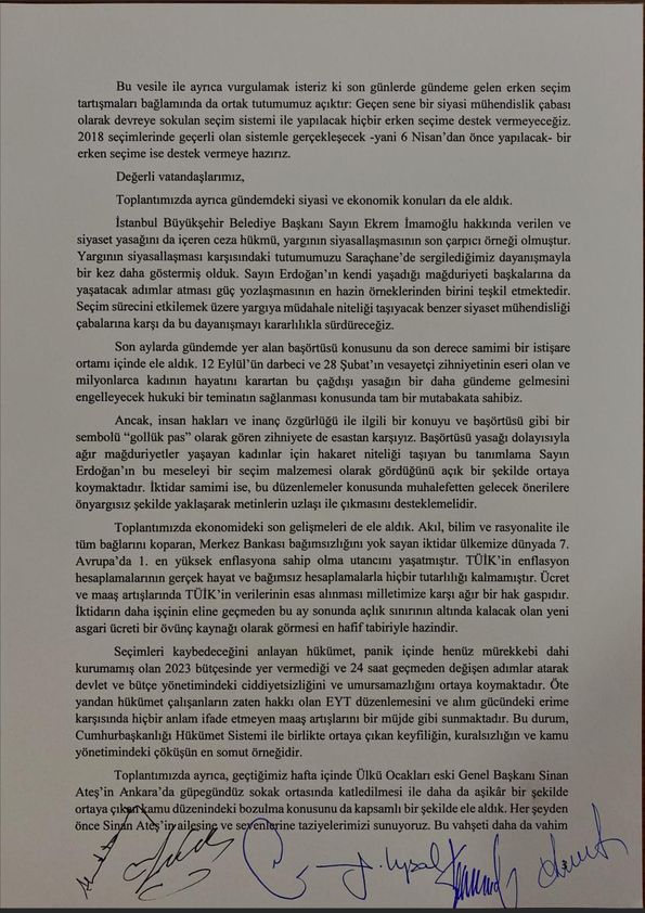 Bu çalışmaların kısa sürede tamamlanabilmesi amacıyla liderler arası toplantıların daha sık aralıklarla yapılmasına karar verdik. Bu bağlamda bir sonraki toplantımız İYİ Parti'nin ev sahipliğinde 26 Ocak tarihinde yapılacaktır.
