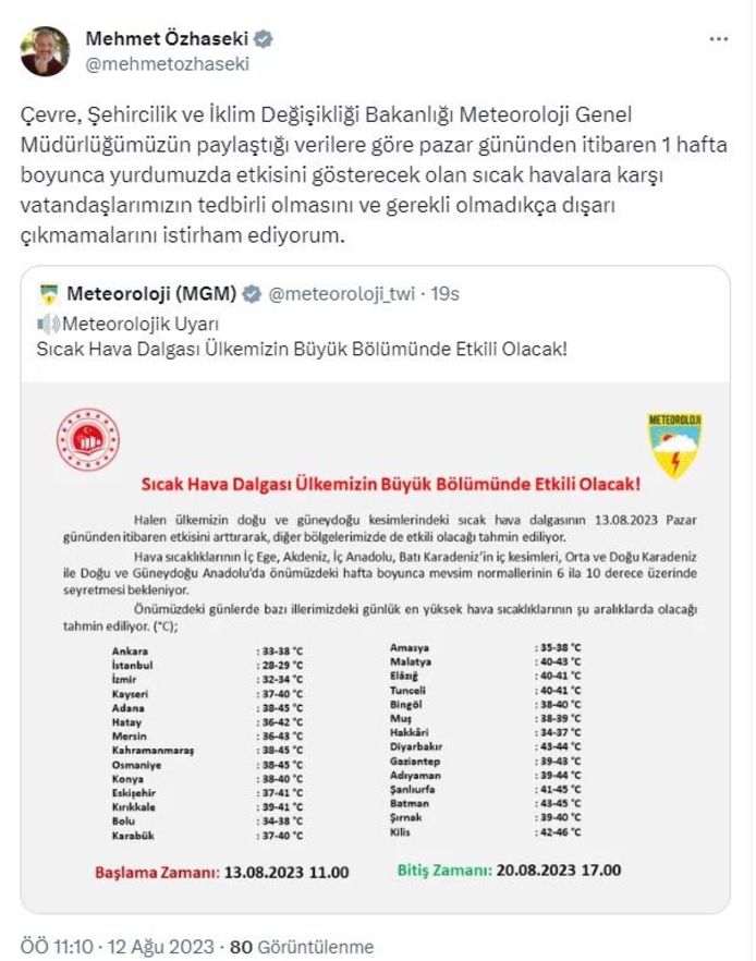 Çevre, Şehircilik ve İklim Değişikliği Bakanı Mehmet Özhaseki, sosyal medya hesabından Meteoroloji Genel Müdürlüğü'nün 13 Ağustos pazar gününden itibaren etkili olacak sıcak hava dalgasına ilişkin uyarısını paylaştı.