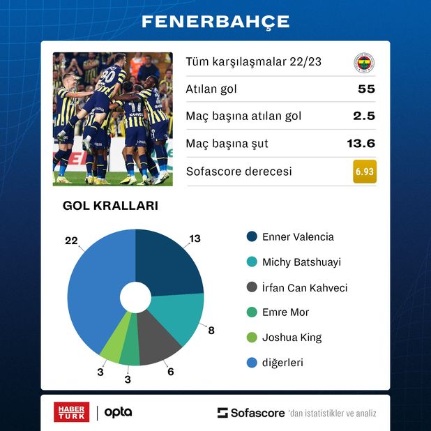 Ayrıca bu sezon Süper Lig ve Avrupa'nın beş büyük liginde maç başına en fazla gol atan dördüncü takım Fenerbahçe oldu. Zirvede ise 12 maçta 38 gol atan Alman devi Bayern Münih bulunuyor. Listede ikinci sırada 37 golle Manchester City, üçüncü sırada ise 13 maçta 36 gol atan Fransız devi PSG yer alıyor.
