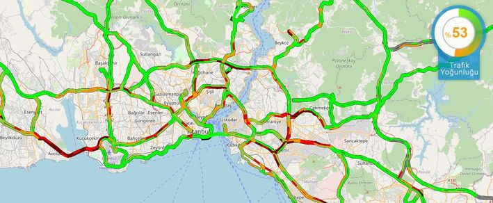 17.30: İstanbul'da yoğunluğun artışa geçtiği bu dakikalarda, Avrupa ve Anadolu yakalarındaki bağlantı yolları ile Fatih Sultan Mehmet Köprüsü Anadolu Yakası istikameti kırmızıya dönmeye başladı. Yoğunluk da yüzde 56 olarak ölçüldü.