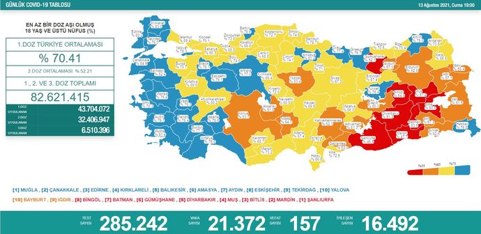 En az bir doz aşı yapılanların oranı en az iller ise Şanlıurfa, Mardin, Bitlis, Muş, Diyarbakır, Gümüşhane, Batman, Bingöl, Iğdır ve Bayburt olarak sıralandı.