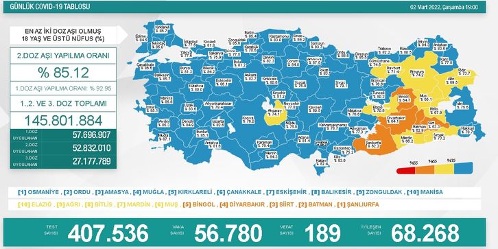 En az 2 doz aşı olan kişi sayısının en yüksek olduğu iller; Osmaniye, Ordu, Amasya, Muğla, Kırklareli, Çanakkale, Eskişehir, Balıkesir, Zonguldak ve Manisa olurken, 2 doz aşı yapılan kişi sayısının en düşük olduğu iller ise Şanlıurfa, Batman, Siirt, Diyarbakır, Bingöl, Muş, Mardin, Bitlis, Ağrı ve Elazığ oldu.