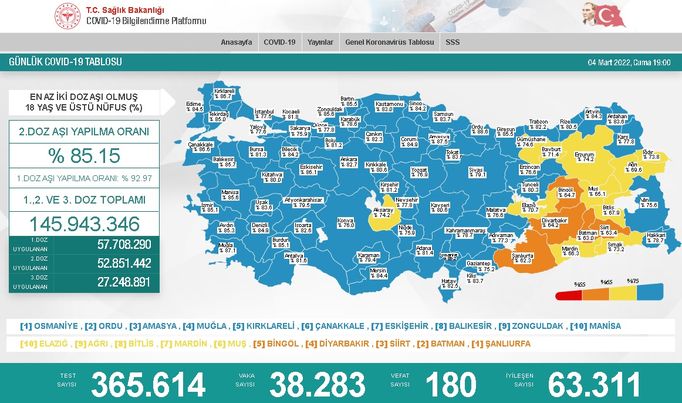 Koronavirüs nedeniyle 180 kişi hayatını kaybederken, 63 bin 311 kişinin de tedavisi ve karantinası sona erdi. 18 yaş ve üzeri nüfusun aşılanması verilerinde 1'inci doz Türkiye ortalaması yüzde 92,97, 2'nci doz ortalaması yüzde 85,15 olarak ölçüldü.