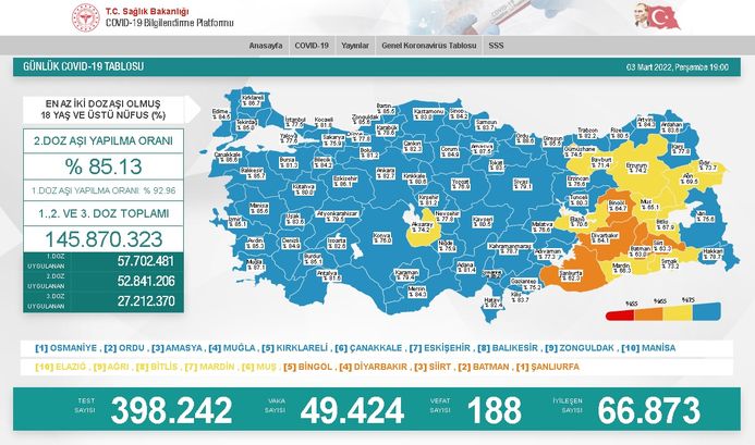 En az 2 doz aşı olan kişi sayısının en yüksek olduğu iller; Osmaniye, Ordu, Amasya, Muğla, Kırklareli, Çanakkale, Eskişehir, Balıkesir, Zonguldak ve Manisa olurken, 2 doz aşı yapılan kişi sayısının en düşük olduğu iller ise Şanlıurfa, Batman, Siirt, Diyarbakır, Bingöl, Muş, Mardin, Bitlis, Ağrı ve Elazığ oldu.