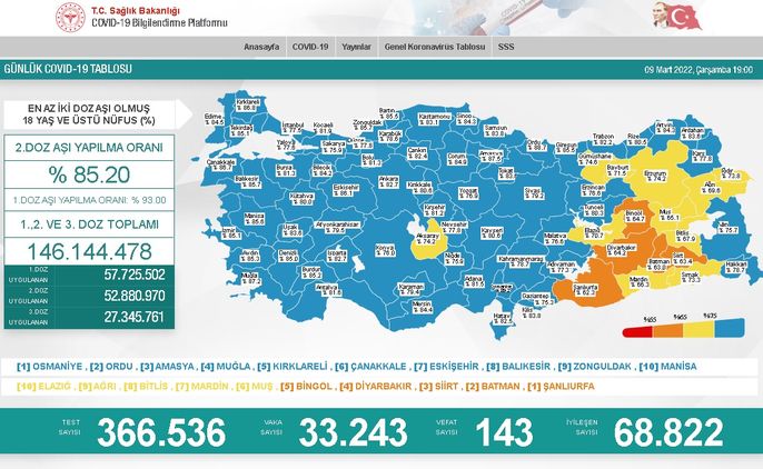 18 yaş ve üstü nüfusta en az iki doz aşı yaptıranların oranının en yüksek olduğu 10 il Osmaniye, Ordu, Amasya, Muğla, Kırklareli, Çanakkale, Eskişehir, Balıkesir, Zonguldak ve Manisa oldu.