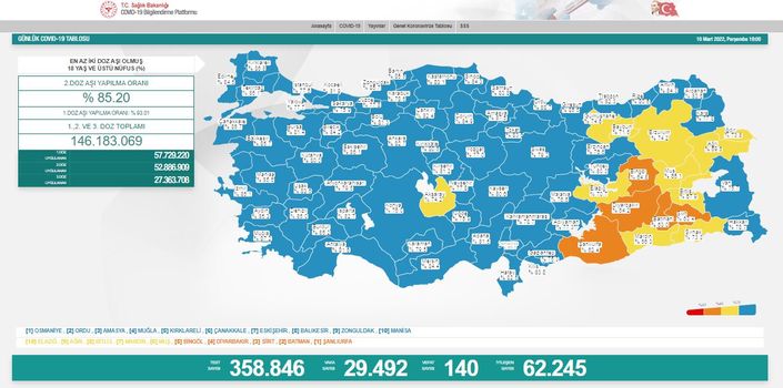 En az iki doz aşı uygulananların oranının en düşük olduğu iller ise Şanlıurfa, Batman, Siirt, Diyarbakır, Bingöl, Muş, Mardin, Bitlis, Ağrı ve Elazığ olarak sıralandı.