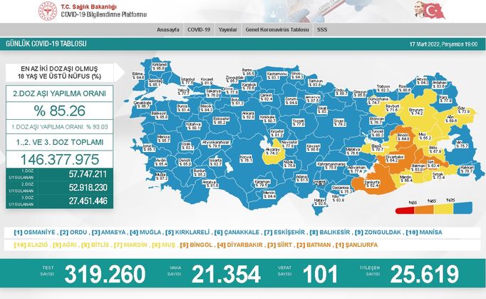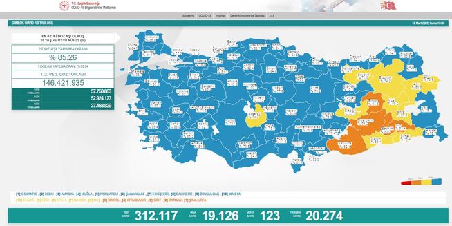 18 yaş üstünde en az iki doz aşı yaptıranların oranının en yüksek olduğu 10 il Osmaniye, Ordu, Amasya, Muğla, Kırklareli, Çanakkale, Eskişehir, Balıkesir, Zonguldak ve Manisa oldu.