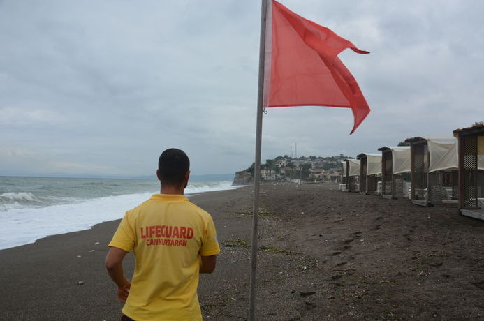 DHA'da yer alan habere göre sahillere, denize girmenin yasak olduğunu gösteren kırmızı bayrak çekildi.