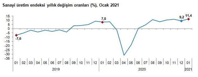 Sanayi üretim endeksi ocakta bir önceki aya göre yüzde 1, geçen yılın aynı ayına göre yüzde 11.4 yükseldi