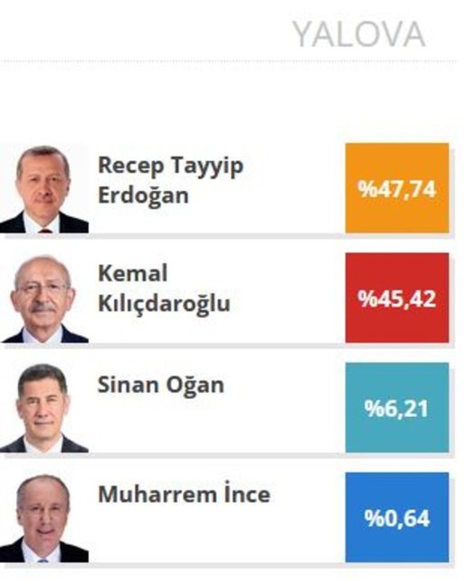 Recep Tayyip Erdoğan: Cumhur ittifakının adayı Cumhurbaşkanı Erdoğan, Türkiye genelinde yüzde 49.5 oy alırken Yalova'da bu oran 47.7 oldu. Hata payı yüzde -1.8.