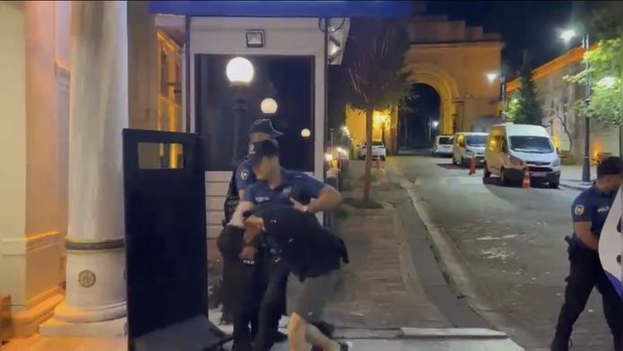 Yaşananlar ise güvenlik kameralarına anbean yansıdı. Görüntülerde, grup uyarıya gelen polislerin üstüne yürüyor. Şahıslardan biri alkol şişesini polise fırlatıyor. Ardından gruptaki bir kişi, polis memuruna yumruk atıyor. Daha sonra da zanlılar polis tarafından etkisiz hale getiriliyor.