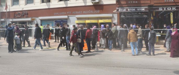 Aile, Çalışma ve Sosyal Hizmetler Bakanlığı'nca ihtiyaç sahiplerine verilecek bin liralık yardım parasını almak için kentte çok sayıda kişi erken saatlerden itibaren Sarayönü ve Eyyübiye semtlerinde bulunan PTT şubelerine gidenler kuyruk oluşturdu.