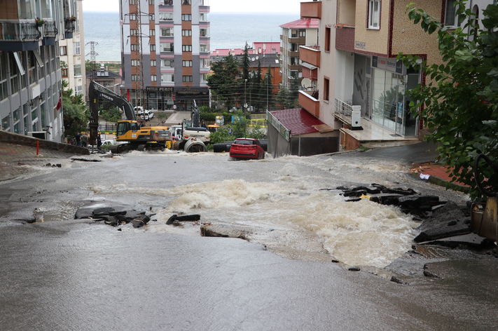 Trabzon'un Ortahisar ilçesinde bugün etkili olan şiddetli yağış sonrası yollar göle dönerken, birçok iş yeri ve katlı otoparkı da su bastı