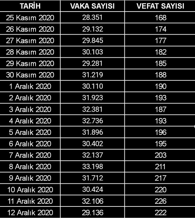 Tablodaki "toplam hasta sayısı" ifadesi, 10 Aralık'ta "toplam vaka sayısı" olarak değiştirilmiş, verilere Kovid-19 hastalarının yanı sıra testi pozitif çıkmasına rağmen semptom göstermeyenler de eklenmişti.