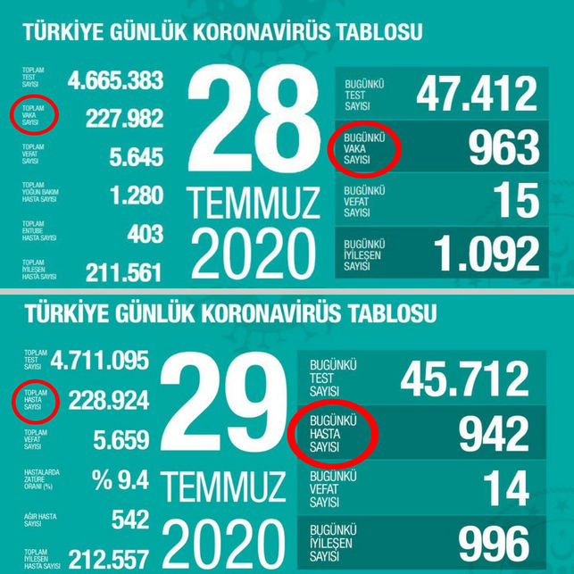 Günlük koronavirüs tablosundaki ilk değişiklik 29 Temmuz'da yapılmıştı. O güne kadar tabloda vaka olarak açıklanan sayılar hasta olarak ifade edilmeye başlanmıştı.