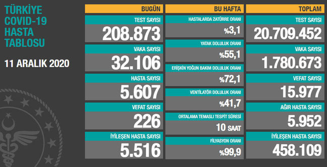 Buna göre, 11 Aralık'taki tabloda 5 bin 516 olarak yer alan "iyileşen hasta sayısı", 12 Aralık'ta 20 bin 191 olarak açıklandı. İyileşenlerin toplam sayısı ise 1 milyon 581 bin 565 oldu.