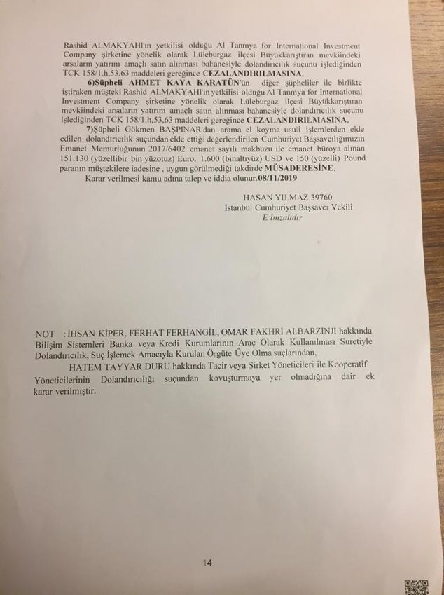 Söz konusu suçlar kapsamında dolandırıldıkları iddia edilen Kuveytli şirketlerin isimleri ise Alshaab Gate Real Estate Company ve Altanmya International Investment.