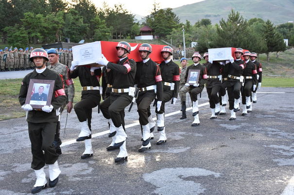 Dağ ve Komando Tugay Komutanlığında düzenlenen törende, Hava Savunma Üsteğmen Emre Kargın ve Şehit Piyade Uzman Onbaşı Hüseyin Mertoğlu'nun, Türk bayrağına sarılı naaşları alana getirildi.
