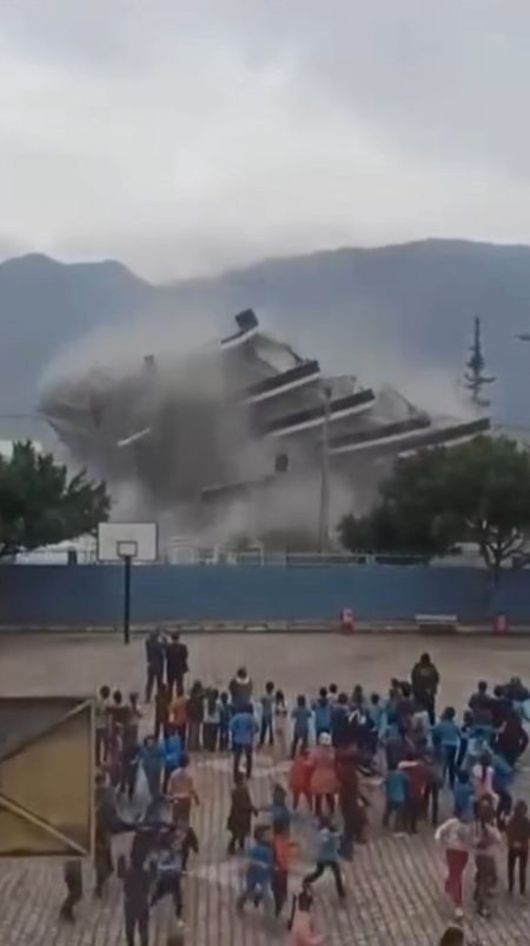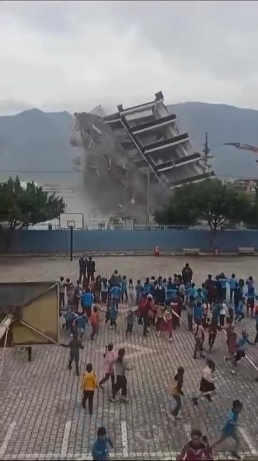 Hatay'ın İskenderun ilçesinde bir ilkokulun yanındaki ağır hasarlı binanın kontrollü yıkımı sırasında oluşan toz bulutu ve etrafa saçılan parçalar nedeniyle bahçedeki öğrenciler koşarak kaçtı.