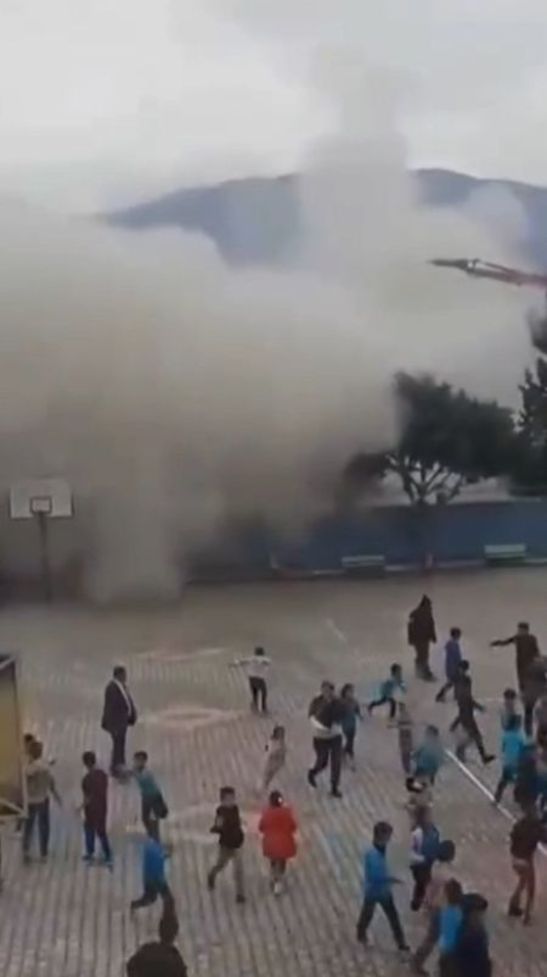 Tozların bahçeye girmesiyle öğrenciler, koşarak kaçtı. Yaşananlar, cep telefonu kamerasına yansıdı.