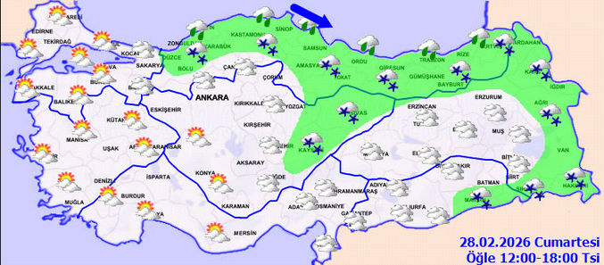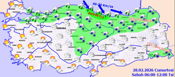 Samsun ve Ordu çevrelerinde kuvvetli olması beklenen yağışların genellikle karla karışık yağmur ve kar, kıyı kesimlerde yağmur şeklinde olacağı tahmin ediliyor. Meteoroloji tarafından "sarı" alarm verilen illerimiz ise şöyle: Artvin, Giresun, Gümüşhane, Ordu, Rize, Samsun, Tokat ve Trabzon.