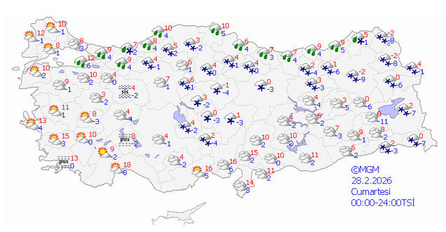 Meteoroloji Genel Müdürlüğü (MGM) olarak yapılan değerlendirmelere göre yurdun kuzey, iç ve doğu kesimlerinin parçalı ve çok bulutlu, Marmara'nın kuzeydoğusu, İç Anadolu'nun doğusu, Karadeniz, Doğu Anadolu'nun kuzey ve doğusu ile Batman, Mardin, Siirt ve Diyarbakır doğu ilçelerinin yağışlı, diğer yerlerin az bulutlu geçeceği tahmin ediliyor.