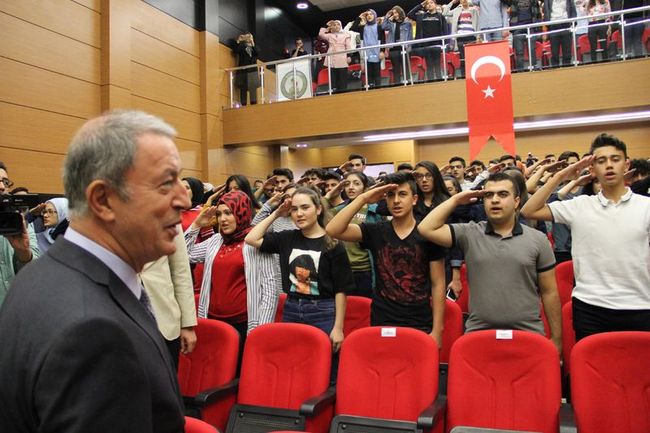 Okulun konferans salonuna girişinde ise öğrenciler tarafından Bakan Akar'a sürpriz yapıldı. Bir ağızdan okul marşını okuyan öğrenciler asker selamı verdi. Akar da asker selamı ile karşılık verdiği öğrencilerin söylediği okul marşına eşlik etti.
