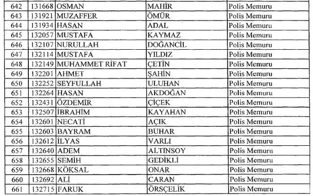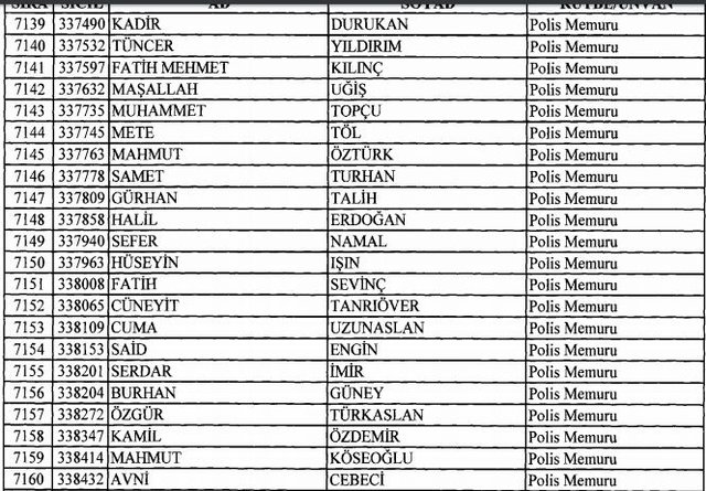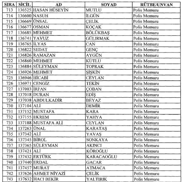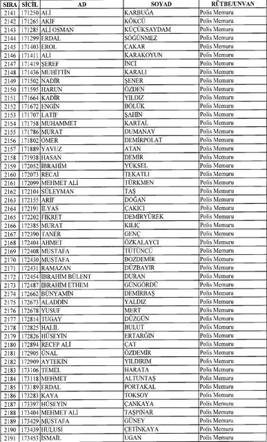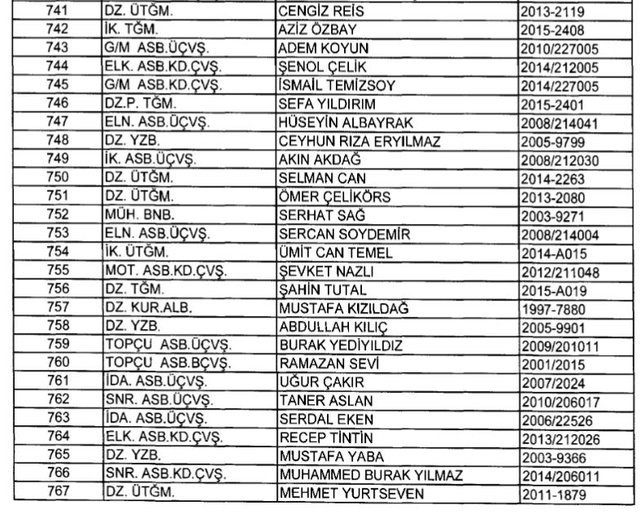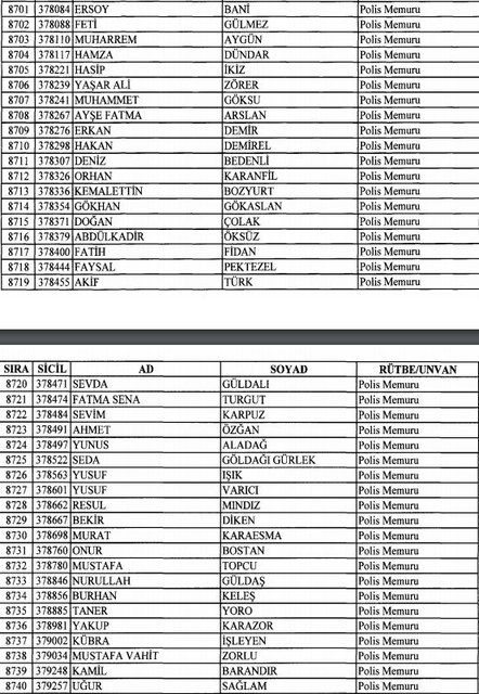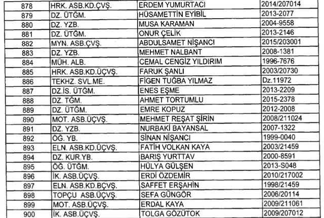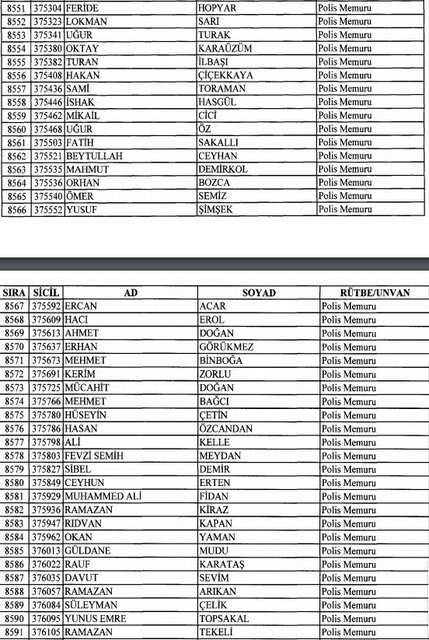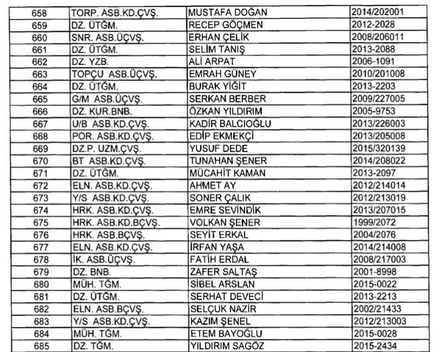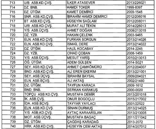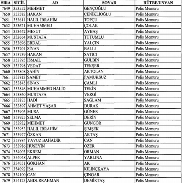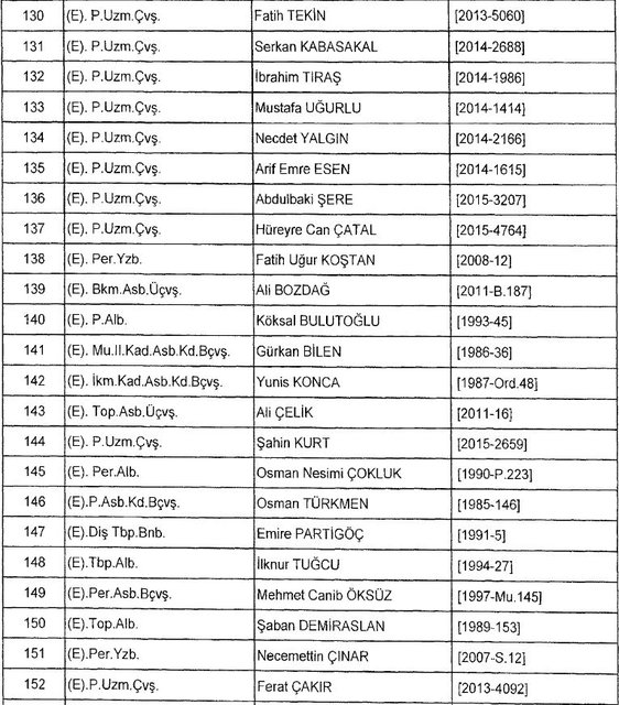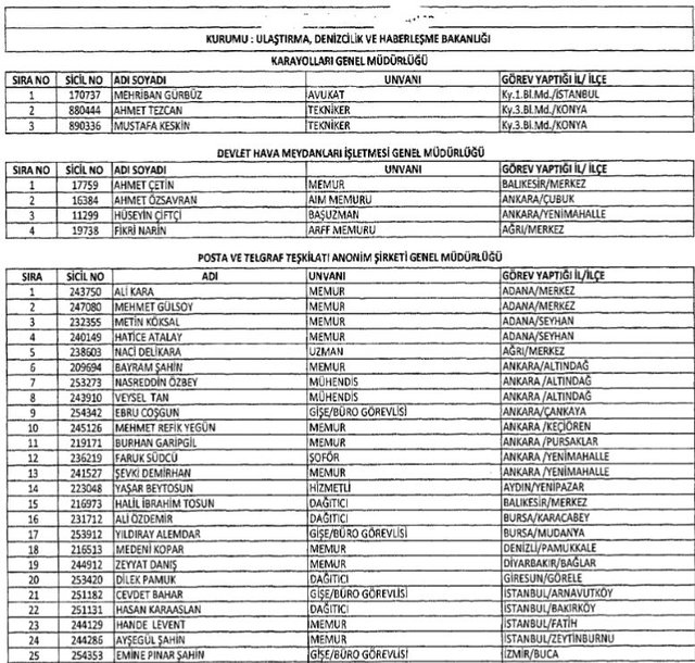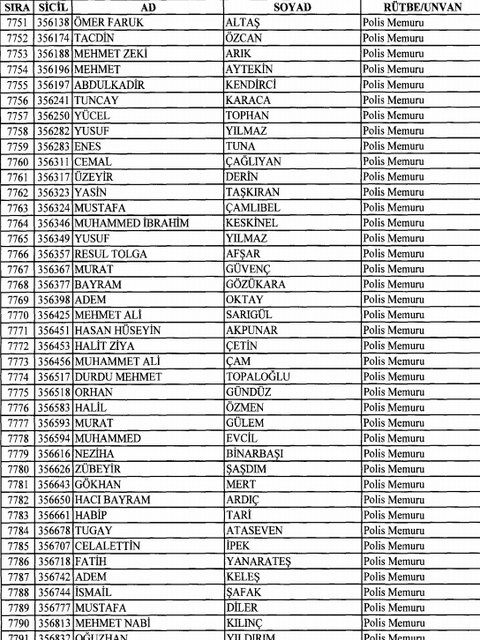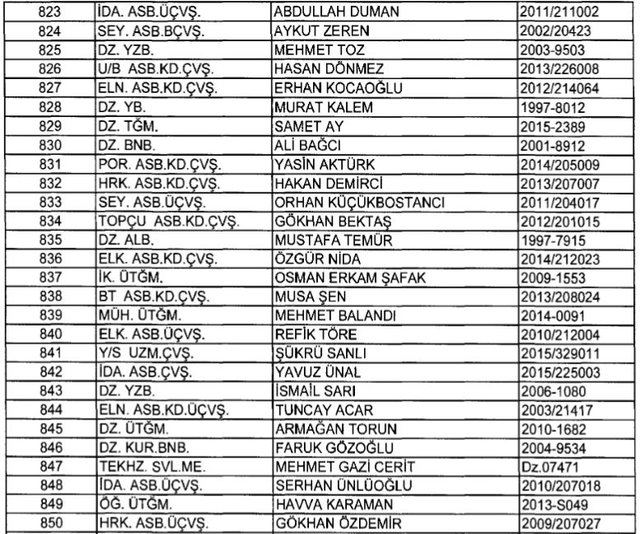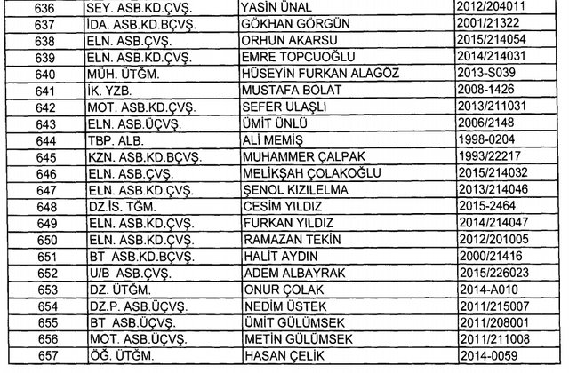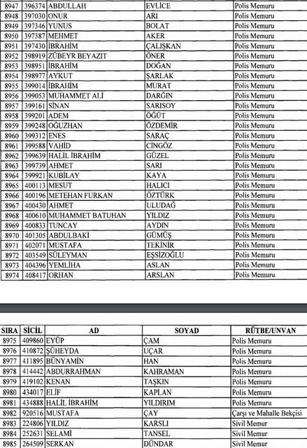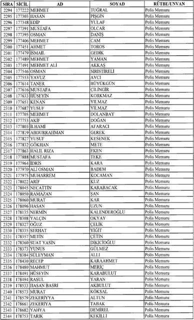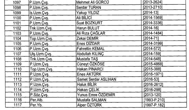 İhraç listesi yayımlandı. Olağanüstü Hal (OHAL) kapsamında yayımlanan 701 sayılı Kanun Hükmünde Kararname (KHK) ile çeşitli kurumlarda görev yapan 18 bin 632 personel kamudan ihraç edildi. Aynı KHK ile 148 personel, kamudaki görevlerine iade edildi. Kurumlarından daha önce ayrılan, TSK'dan 324, Emniyet Genel Müdürlüğünden 1167 ve jandarmadan 35 personelin rütbeleri 701 sayılı KHK ile alındı. İşte son KHK ihraç listesi...
