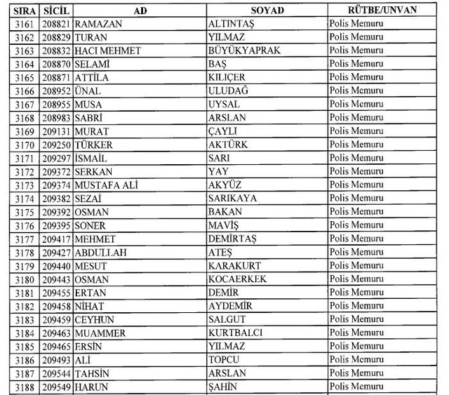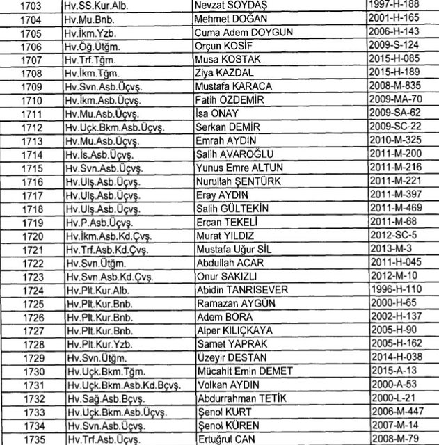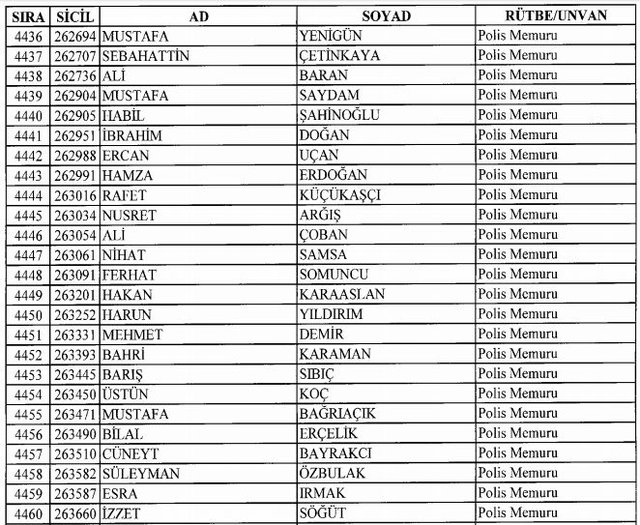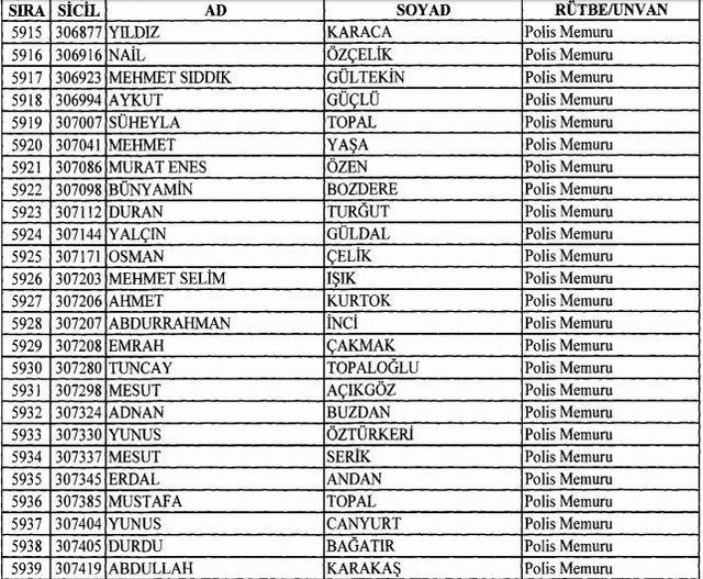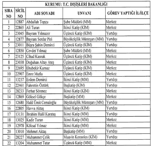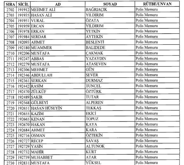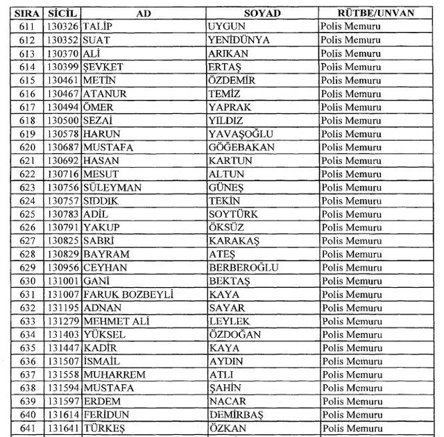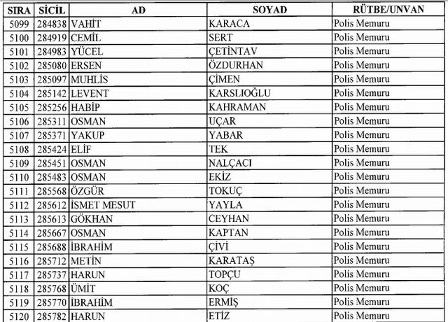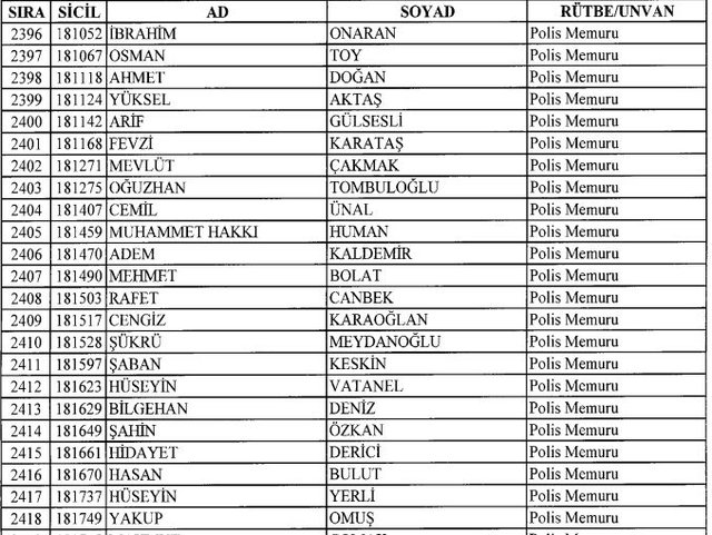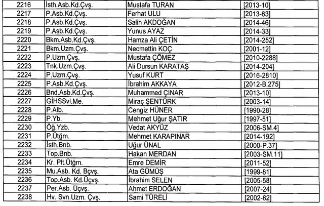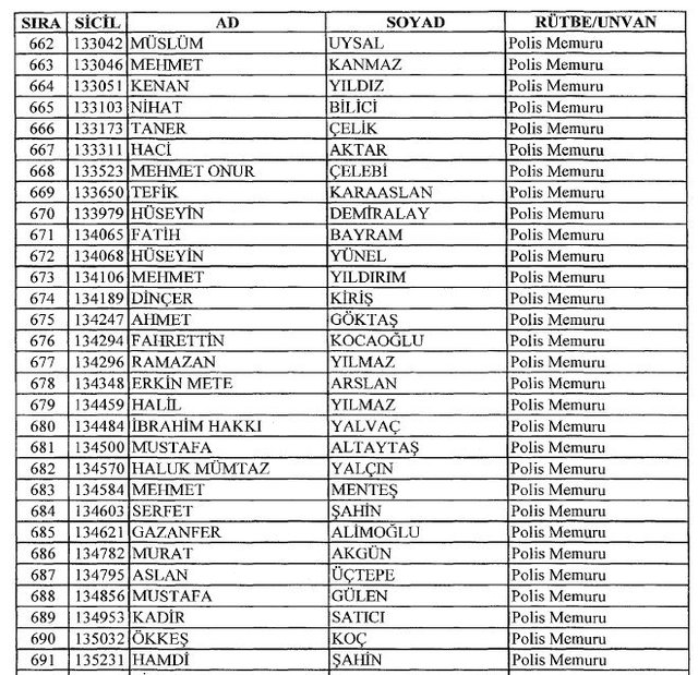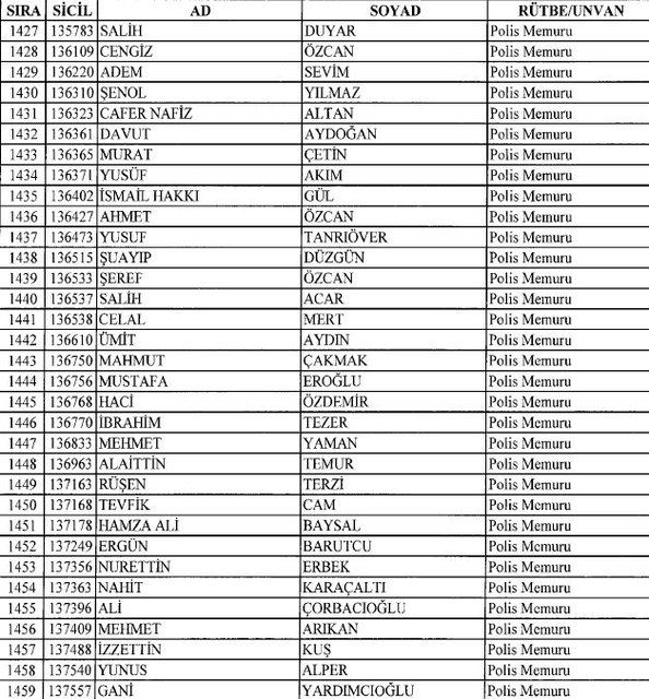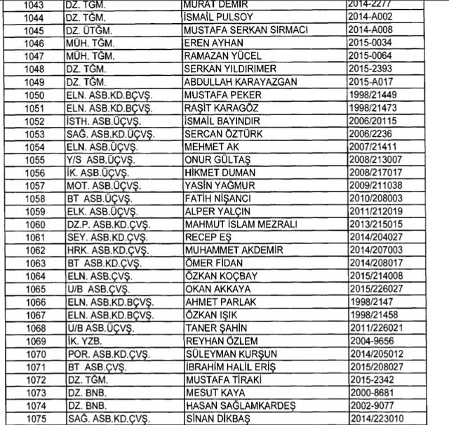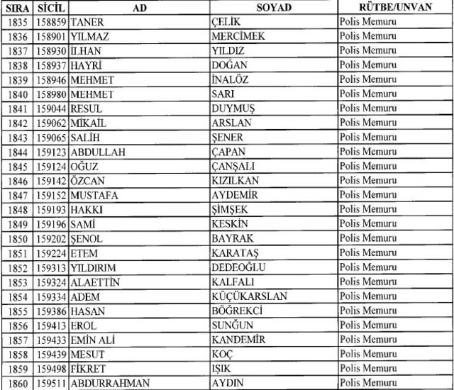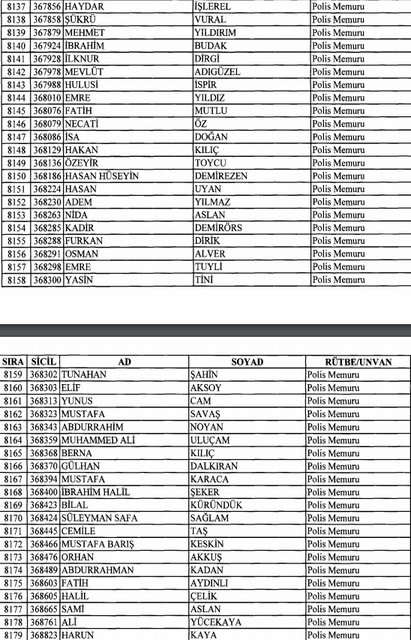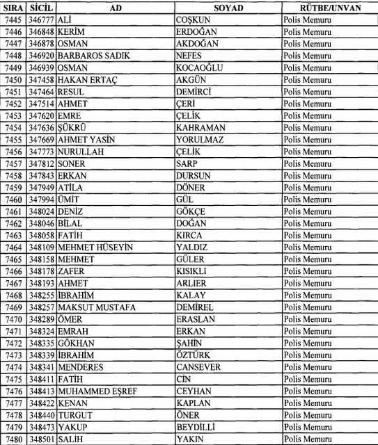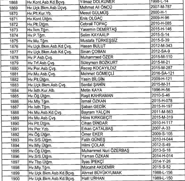 İhraç listesi yayımlandı. Olağanüstü Hal (OHAL) kapsamında yayımlanan 701 sayılı Kanun Hükmünde Kararname (KHK) ile çeşitli kurumlarda görev yapan 18 bin 632 personel kamudan ihraç edildi. Aynı KHK ile 148 personel, kamudaki görevlerine iade edildi. Kurumlarından daha önce ayrılan, TSK'dan 324, Emniyet Genel Müdürlüğünden 1167 ve jandarmadan 35 personelin rütbeleri 701 sayılı KHK ile alındı. İşte son KHK ihraç listesi...