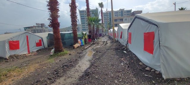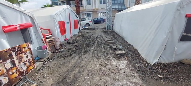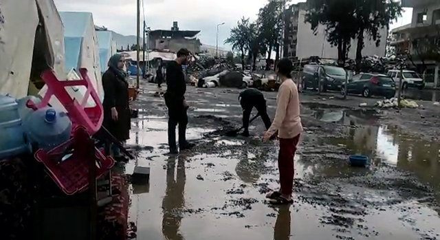 Yoğun yağışla birlikte İskenderun ilçesinin farklı bölgelerinde bulunan çadır kentlerin ve konteynerlerin etrafı da çamur oldu.