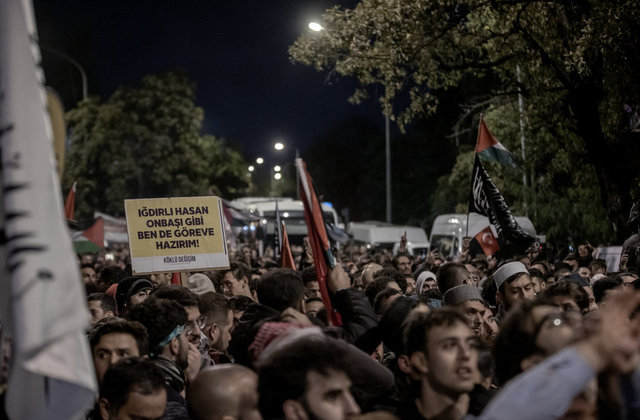 Ellerinde Filistin bayrakları taşıyan, zaman zaman sloganlar atan ve Büyükelçilik konutuna girmek isteyen gruba, polis ekiplerinin müdahalesi sonrası geniş güvenlik önlemleri alındı, yol trafiğe kapatıldı.