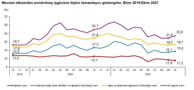 Zamana bağlı eksik istihdam, potansiyel işgücü ve işsizlerden oluşan atıl işgücü oranı 2021 yılı Ekim ayında bir önceki aya göre 1 puan artarak yüzde 22,8 oldu. Zamana bağlı eksik istihdam ve işsizlerin bütünleşik oranı yüzde 15,6 iken, potansiyel işgücü ve işsizlerin bütünleşik oranı yüzde 18,7 olarak gerçekleşti.