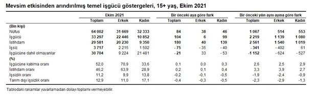 İstihdam edilenlerin sayısı 2021 yılı Ekim ayında bir önceki aya göre 180 bin kişi artarak 29 milyon 581 bin kişi, istihdam oranı ise 0,2 puanlık artış ile yüzde 46,2 oldu.